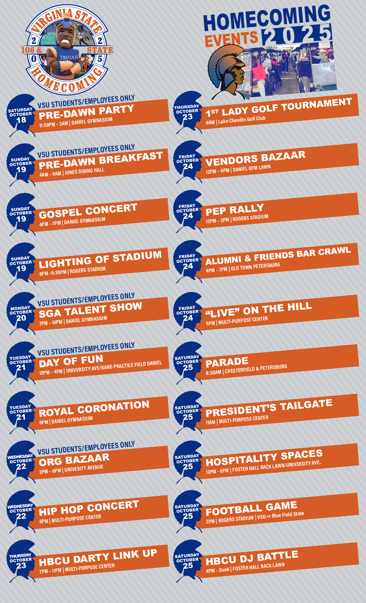 Pre-Dawn Party Saturday, October 18, 2025 12:00 AM at Daniel Gymnasium Pre-dawn Breakfast Sunday, October 19, 2025 4:00 AM at Jones Dining Hall Gospel Concert Sunday, October 19, 2025 4:00 PM at Daniel Gymnasium Lighting of the Stadium Sunday, October 19, 2025 8:00 PM at Rogers Stadium SGA Talent Show Monday, October 20, 2025 7:00 PM at Daniel Gymnasium Day of Fun Tuesday, October 21, 2025 12:00 PM at University Ave/Band Practice Field Daniel Royal Coronation Tuesday, October 21, 2025 6:00 PM at Daniel Gymnasium Org Bazaar Wednesday, October 22, 2025 2:00 PM at University Avenue Hip Hop Concert Wednesday, October 22, 2025 8:00 PM at the Multi-Purpose Center HBCU DARTY Link Up Thursday, October 23, 2025 7:00 PM at the Multi-Purpose Center VSU First Lady’s 3rd Annual Golf Tournament Thursday, October 23, 2025 8:00 AM at Lake Chesdin Golf Club Vendors Bazaar Friday, October 24, 2025 12:00 PM at the Old Band Practice Field Pep Rally Friday, October 24, 2025 12:00 PM at Rogers Stadium Trojan Alumni & Friends Bar Crawl Friday, October 24, 2025 4:00 PM at Old Town Petersburg Harlem Nights On The Hill Friday, October 24, 2025 6:00 PM at the Multi-Purpose Center Parade Saturday, October 25, 2025 9:00 AM in Petersburg President’s Tailgate Saturday, October 25, 2025 10:30 AM at the Multi-Purpose Center Hospitality Spaces Saturday, October 25, 2025 12:00 PM on the Foster Hall Back Lawn/Univ. Ave HBCU DJ Battle Saturday, October 25, 2025 4:00 PM on the Foster Hall Back Lawn Football Game vs Blue Field State Saturday, October 25, 2025 2:00 PM at Rogers Stadium