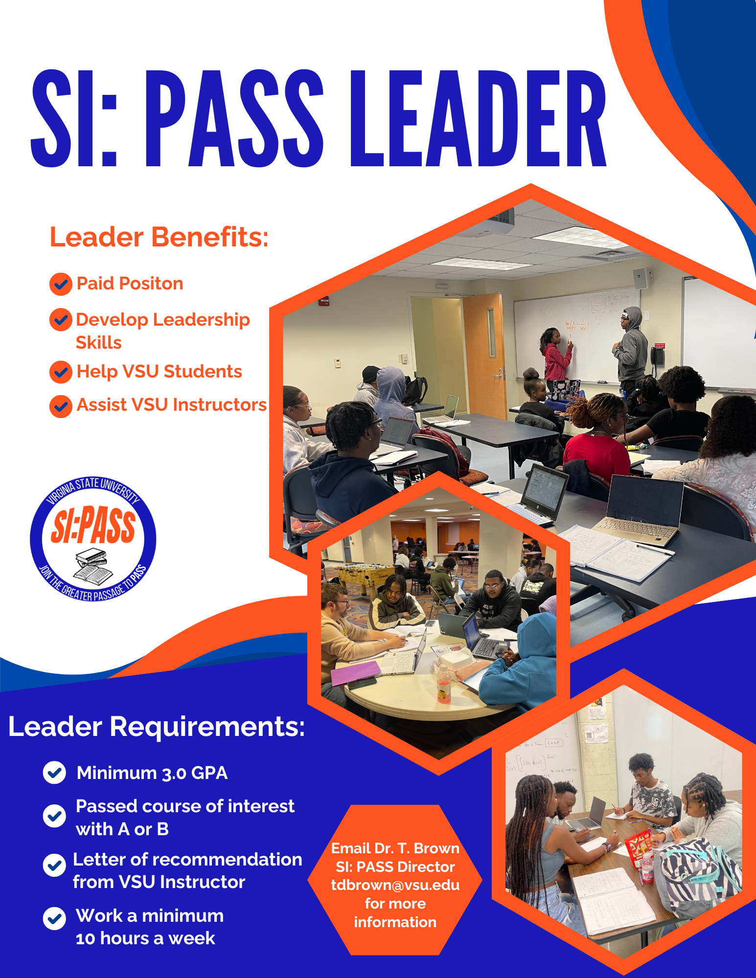 SI: PASS Leader Flyer The SI: PASS Leader position is a paid opportunity that allows students to develop leadership skills while helping VSU students succeed academically and assisting instructors in supporting their courses. As an SI: PASS Leader, students gain professional experience, strengthen their communication and facilitation skills, and contribute to a collaborative learning environment on campus. To qualify for the SI: PASS Leader position, students must have a minimum cumulative GPA of 3.0, must have passed the course of interest with a grade of A or B, and must submit a letter of recommendation from a VSU instructor. Leaders are also required to work a minimum of 10 hours per week. Students who are interested in learning more about becoming an SI: PASS Leader or applying for the position should contact Dr. Taneisha Brown, SI: PASS Director, by emailing tdbrown@vsu.edu for additional information.