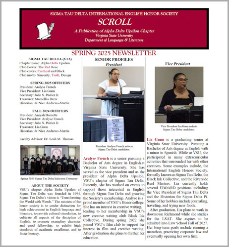 The Department of Languages and Literature at Virginia State University is committed to academic excellence and cultural enrichment through the study of language, literature, and writing. the department offers diverse courses and programs in English, World Languages, Drama, Speech, and Interdisciplinary Humanities to prepare students for professions in media, education, law, public service, and other fields. Students can pursue a Bachelor of Arts in English with concentrations in African American/Africana Literature, Literatures of the World, Creative Writing, Linguistics, Professional Writing, and Secondary Education, which may lead to a teaching endorsement. The Department offers Minors in Africana Studies, Drama, English, Film Studies, French, Spanish, Digital Humanities, Hip-Hop Studies, and Writing. Students engage with a broad spectrum of literary texts, rhetorical strategies, and linguistic traditions while cultivating strong analytical, creative, and communication skills. The department’s curriculum emphasizes the transformative power of language to shape human experience, promote social justice, and reflect diverse perspectives across time and cultures. Through innovative coursework, research opportunities, and community engagement, the department nurtures intellectual curiosity, global competence, and a lifelong appreciation for the written and spoken word.