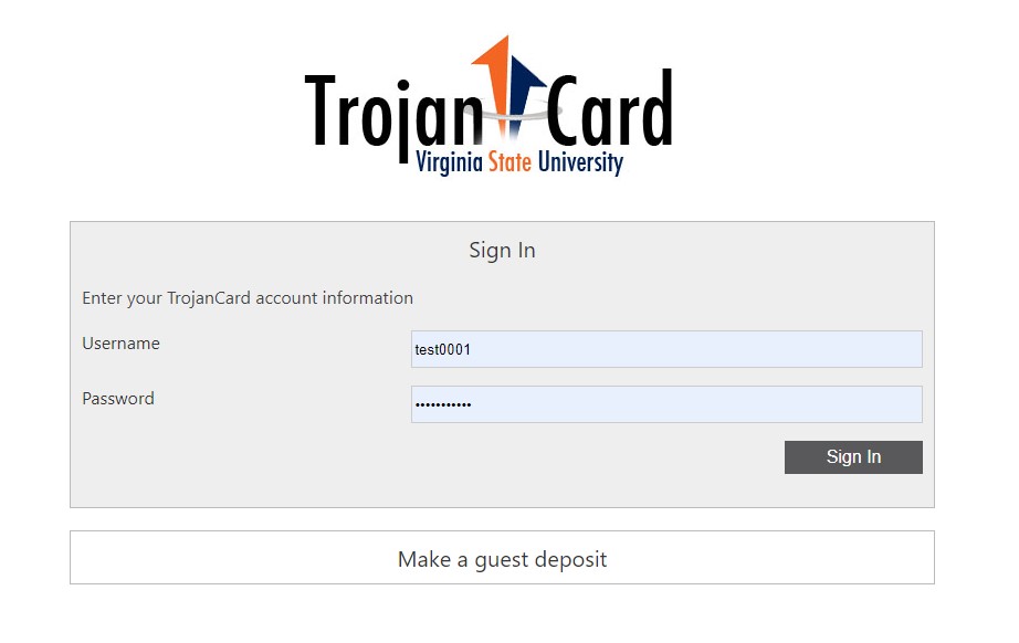 To get started, visit: https://trojancard.vsu.edu/- To open the portal, click on “Student & Staff Login.” You will need to enter your unique University ID (without the @students.vsu.edu) and password.